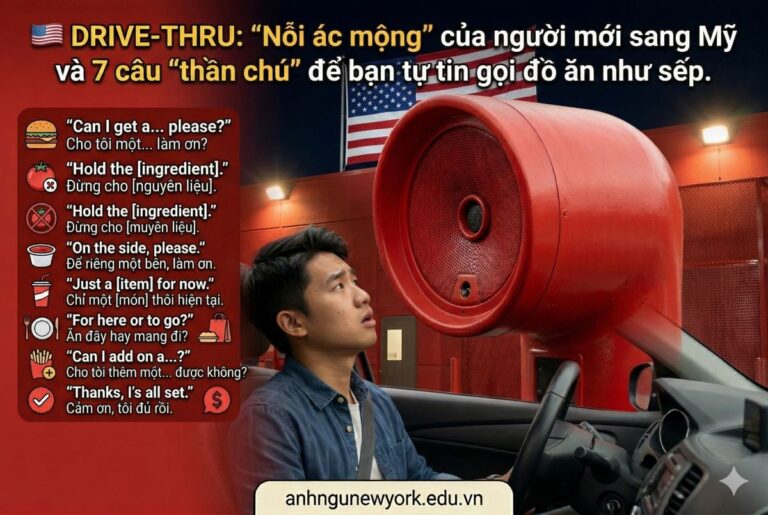 Hôm nay, Friends English sẽ trang bị cho bạn Bộ bí kíp 7 câu “thần chú” Giao tiếp qua loa Drive-thru để bạn tự tin vượt qua nỗi sợ này. Hãy quên ngữ pháp hàn lâm đi, đây là những cụm từ “sinh tồn” giúp bạn có đồ ăn nhanh gọn!