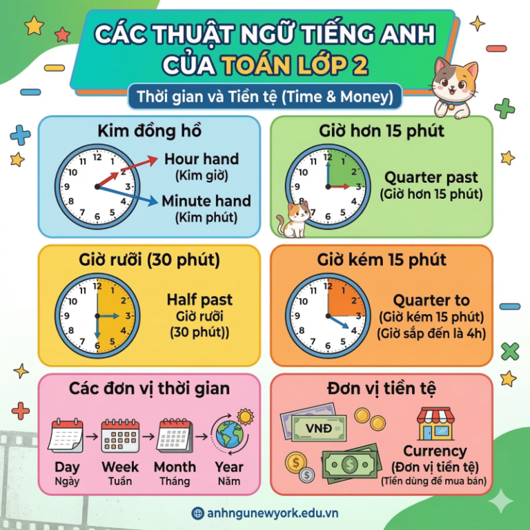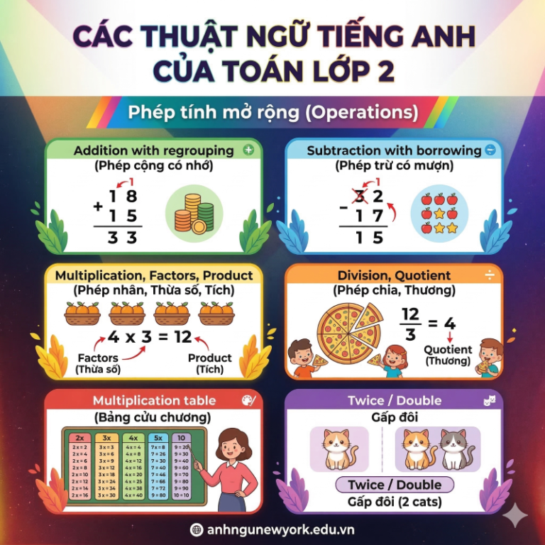 Tiếp nối lộ trình chinh phục Toán Tiếng Anh, chương trình Toán lớp 2 sẽ bắt đầu xuất hiện các khái niệm phức tạp hơn một chút như số có ba chữ số, phép nhân, phép chia cơ bản và xem đồng hồ chi tiết.