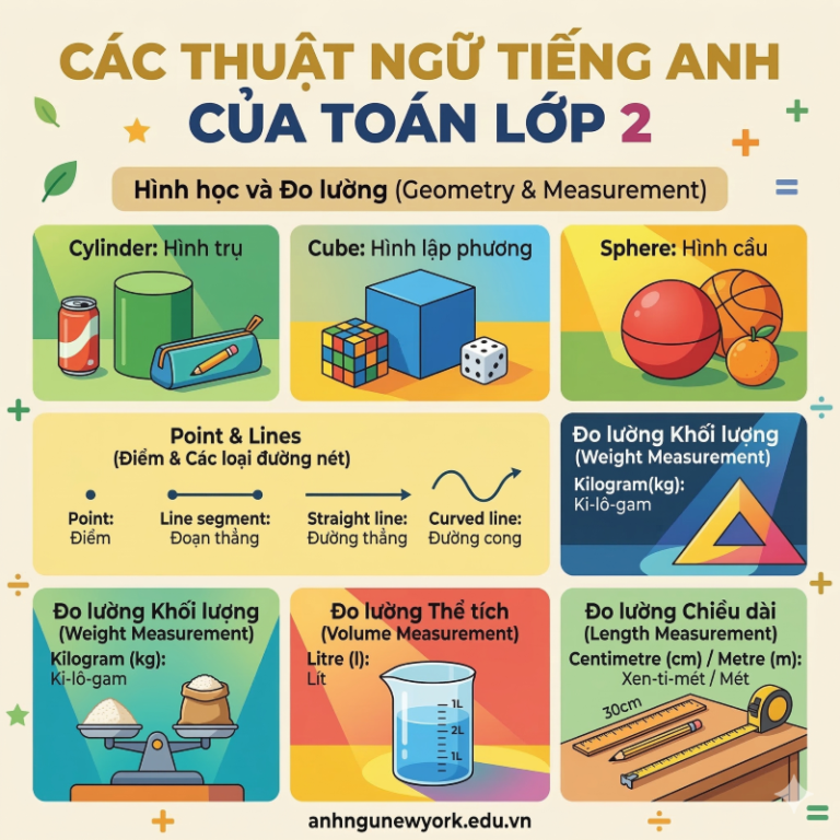 Gợi ý cho bạn: Với các từ vựng hình khối (Cylinder, Cube…), bạn nên chuẩn bị sẵn các vật thể thật trong lớp để vừa cầm vừa nói tên tiếng Anh, học sinh sẽ rất hào hứng và bạn cũng dễ ghi nhớ hơn.