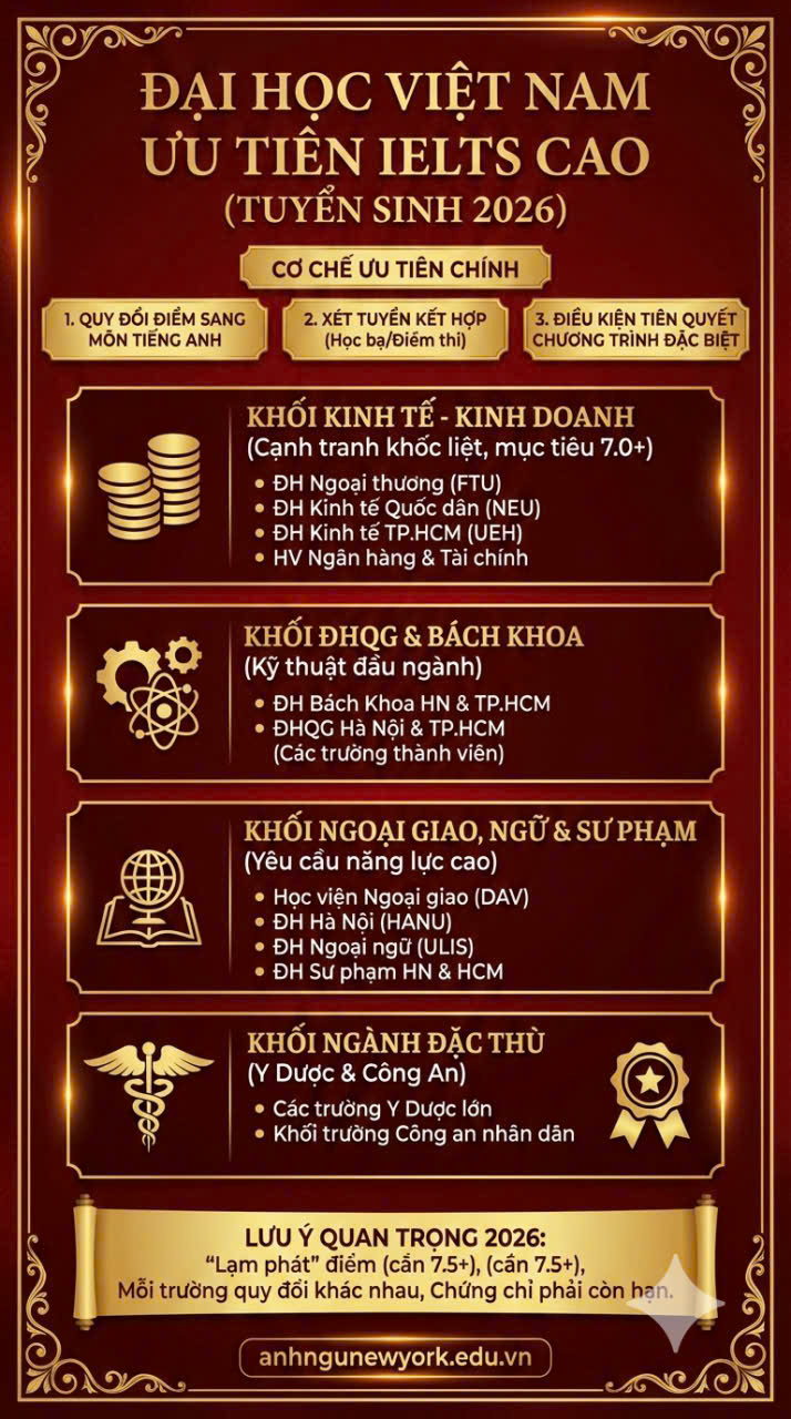 ĐẠI HỌC VIỆT NAM ƯU TIÊN THÍ SINH CÓ ĐIỂM IELTS CAOCác trường khối kinh tếCác trường khối đại học quốc gia và bách khoaCác trường khối ngoại gia, ngoại ngữ và sư phạmCác khối ngành đặc thù