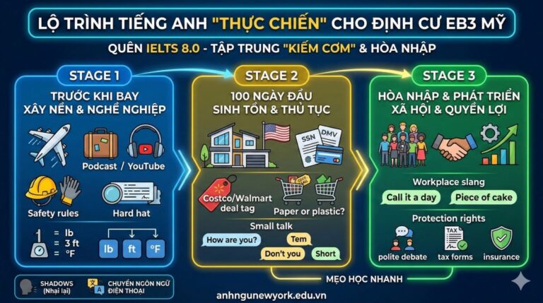 Định cư EB3 cần tiếng Anh “sinh tồn” và “nghề nghiệp”. Bạn không cần học để viết luận văn; bạn học để đi làm, lái xe, thuê nhà và mua sắm ngay lập tức.