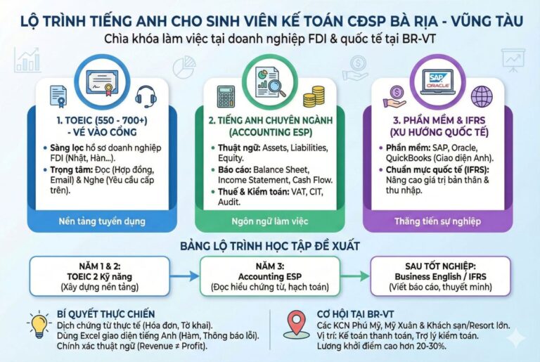 Với sinh viên ngành Kế toán tại Trường Cao đẳng Sư phạm Bà Rịa – Vũng Tàu, tiếng Anh chính là “vũ khí” để bạn thoát khỏi sự cạnh tranh ở các vị trí kế toán nội bộ thông thường và tiến vào các doanh nghiệp FDI (vốn đầu tư nước ngoài) tại các KCN Phú Mỹ, Mỹ Xuân hay các khách sạn/resort lớn.