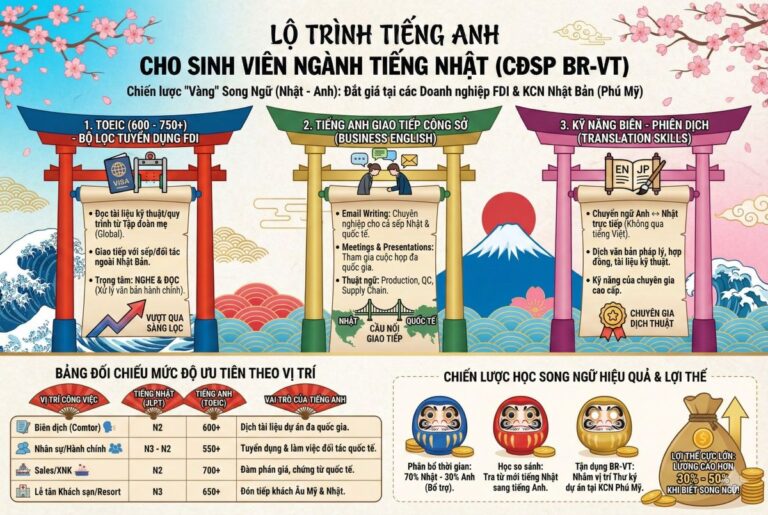 Việc kết hợp **Tiếng Nhật** và **Tiếng Anh** (song ngữ song hành) chính là chiến lược “vàng” giúp sinh viên ngành Tiếng Nhật tại **Trường Cao đẳng Sư phạm Bà Rịa – Vũng Tàu** trở thành những ứng viên cực kỳ đắt giá.